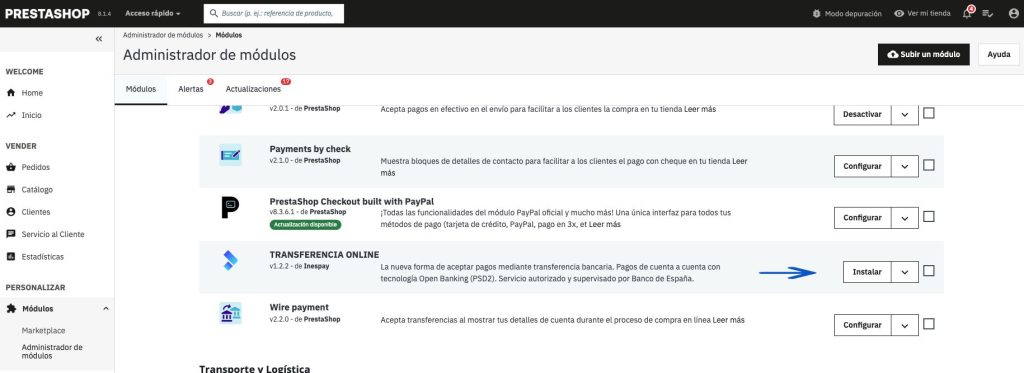 1. Una vez que la instalación haya sido exitosa, busca el módulo Inespay en la lista de módulos.